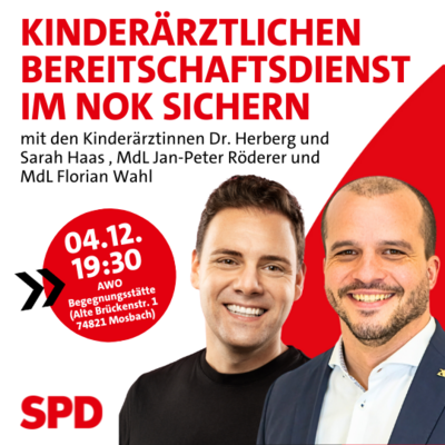 Neben den bereits bekannten Plänen der Kassenärztlichen Vereinigung Baden-Württemberg zur Schließung von 30% der bisherigen Notfallpraxen im Land mehren sich auch die Gerüchte, dass der sehr gut funktionierende kinderärztliche Notdienst im Neckar-Odenwald-Kreis, dem auch Eberbach und Neckarbischofsheim im Rhein-Neckar-Kreis angeschlossen sind, ebenfalls umorganisiert und zentral nach Bad Mergentheim verlagert werden soll. Bisher hat die Kassenärztliche Vereinigung jedoch trotz Nachfragen von Landrat, Bürgermeistern und dem SPD-Landtagsabgeordneten Jan-Peter Röderer keine eindeutige Aussage dazu getroffen. Am Mittwoch, den 4.12., um 19.30 Uhr wird Röderer deshalb in der AWO-Begegnungsstätte Mosbach in der Alten Brückenstraße 1 mit folgenden Gästen über die Zukunft des kinderärztlichen Bereitschaftsdienstes im Neckar-Odenwald- und im Rhein-Neckar-Kreis und die Folgen einer möglichen Verlagerung sprechen: